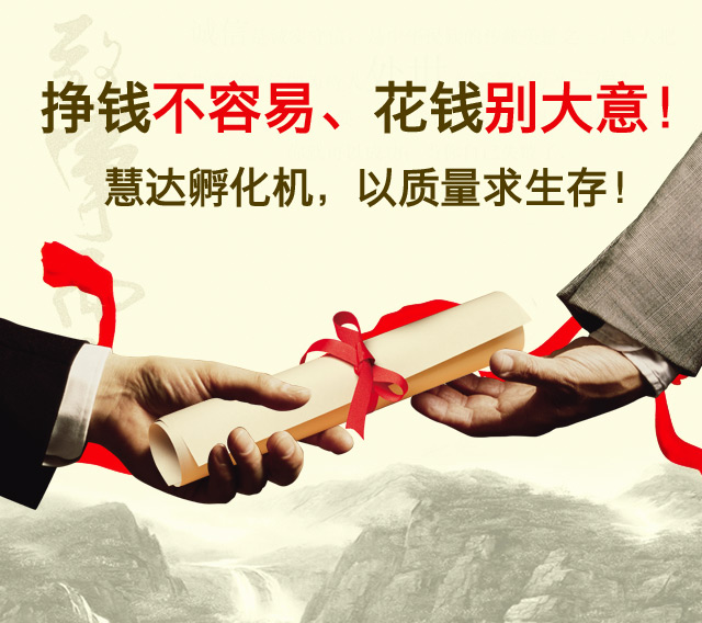 山东德州慧达孵化设备有限公司是一家生产孵化机、孵化设备以及小型孵化设备的专业研发制造企业,专门从事孵化机、孵化设备的研发、生产、销售一条龙服务。 公司始建于1998年,厂房占地面积3000平米,交通十分便利。公司新研制的第9代全自动孵化机系列产品外型用彩钢板、铝合金包边。保温性极强、孵化性能稳定,双温双控、多功能、全自动、超温、低温、自动报警、煤电两用型、免除了您没电时的后顾之忧,产品已销往全国三十一个省市自治区、并且出口韩国、印度、新加坡、俄罗斯、日本、越南、南非等多个国家和地区,年产销达6000台,公司在十余年的研制实践经验中不断创新,使产品不断完善,为用户带来效益,得到广大用户的一致好评。